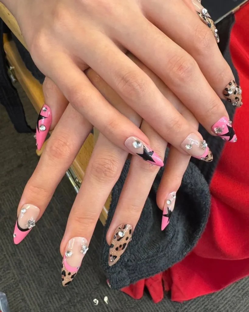 A mistura de rosa e preto aparece com francesinha, estrelas desenhadas, animal print e aplicações de strass. Um combo criativo que mostra domínio de técnicas artísticas e composição visual.