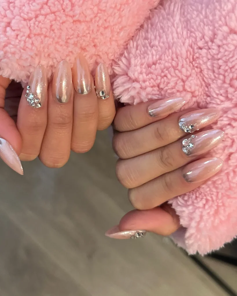 Delicadeza e sofisticação com acabamento perolado e aplicações estratégicas de strass. Uma técnica perfeita para atender clientes que buscam unhas elegantes e modernas.
